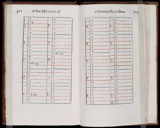The image is of John Locke’s 1705 “New method of a commonplace book.” Looks like Locke wanted to add some structure to the Renaissance mess of just jotting things down to ease future retrieval. This is housed in the Beinecke rare book library at Yale.
