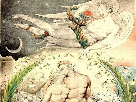 The featured image is the 1808 Butts Set version of William Blake’s “Satan Watching the Endearments of Adam and Eve.” Blake illustrated many of Milton’s works and illustrated Paradise Lost three times, commissioned by three different patrons. The color scheme is slightly different between the Thomas, Butts, and Linnell illustration sets. I prefer the Butts. I love this image. In it, I see Adam relegated to a supporting actor, a prop like a lamp sitting stage left to illuminate the real action between Satan and Eve. I feel empathy for Satan, want to ease his loneliness and forgive him for his unbridled ambition, as he hurdles himself tragically into the figure of the serpent to seduce Eve. I identify with Eve, identify with her desire for more, see through her eyes as they look beyond the immediacy of the sexual act and search for transcendence, the temptation that ultimately leads to her fall. The pain we all go through as we wise into acceptance, and learn how to love.